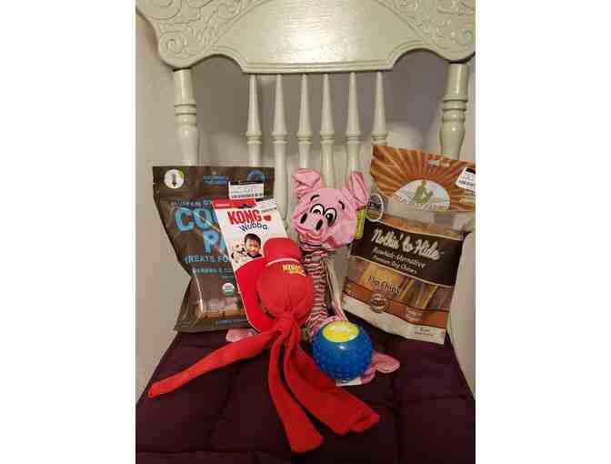 Nerf dog ball, Flathead pig dog toy, Kong Wubba toy, banana & coconut Cookie Pal treats, and Fieldcrest Farms Peanut Butter dog chews (rawhide alternative)
