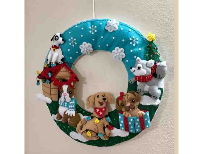 Adorable hand stitched felt and sequin Christmas wreath. Features 5 different dogs showing their Christmas spirit. Measures approximately 16" x 15". Brand new.
