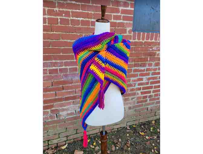 She's a rainbow! Wearing this hand-made shawl will uplift your spirits on even the cloudiest of days. Crafted from acrylic-non-allergic yarn. Perfect for any outfit and ideal for new mother and baby for a cover-up when nursing.