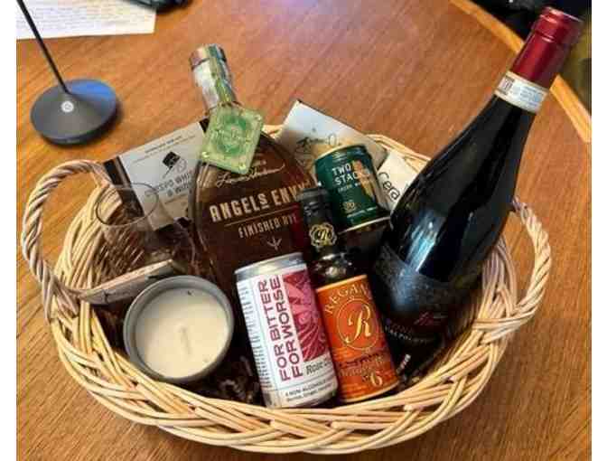 Basket containing Angels Envy Rya, Amarone wine, bitters, a candle and other Misc items