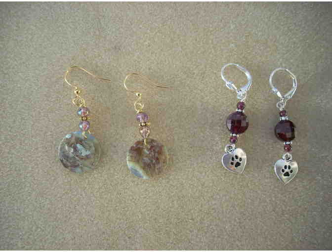 This lot has 2 pair of earrings: -Shell round that dangles with purple beads and hypoallergenic ear wires. -Faceted Garnets with dog paw charm on hypoallergenic lever backs.