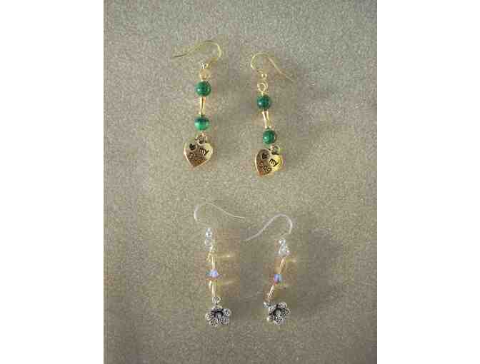 This lot contains 2 pairs of earrings: -Malachite rounds separated by a gold dog bone bead and accented by a "love my dog" charm on hypoallergenic ear wires. -Silver flower charm accented by a topaz Swarovski crystal on hypoallergenic ear wires.