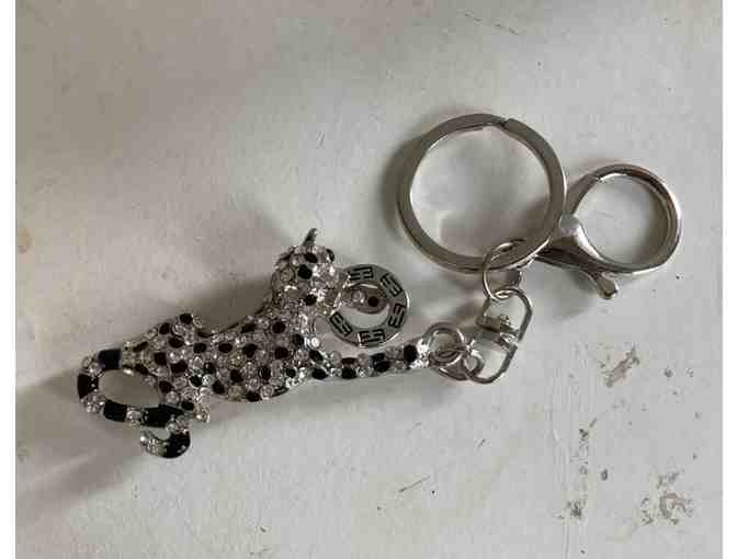 This keyring was purchased new and has not been used. Silver-tone metal with clear rhinestones and black enamel. Panther measures about 2.5 in x 1.25 in. Full length of panther and keyring is 5 in. There are a few minor scuffs noted on the clip from being handled, but otherwise in excellent condition with all stones present.