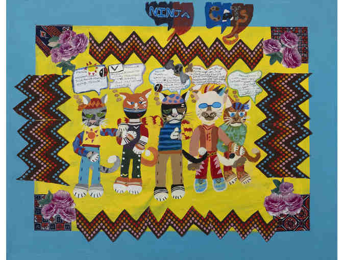 Ninja Cats Weekend get Together, 2022, acrylic and mixed media on canvas, 22 in x 28 in