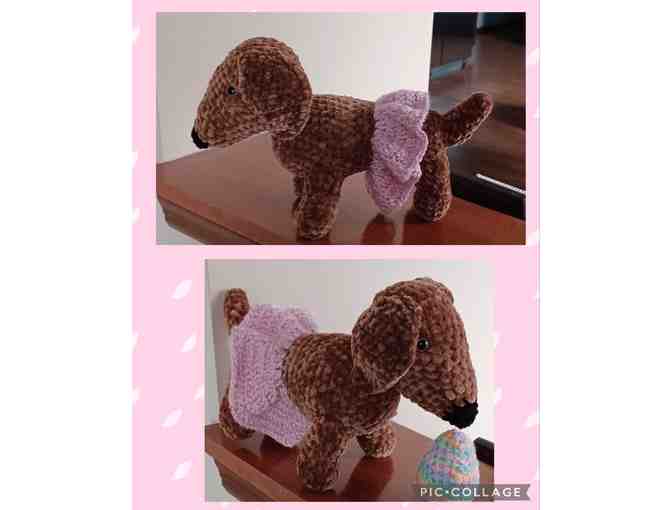 This gorgeous crocheted dachshund is 11 inches from the nose to the end of the tail. From the top of the head to the bottom of the leg is 6 inches. The dachshund is made with chenille yarn. The tutu is pink yarn with metallic thread. Bid higher for the dachshunds as shipping is included with your winning bid!