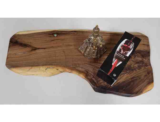 This handmade walnut board is great for any occassion, and has subtle turqouse colored details. Also in this lot is the Infant of Prague and a magic wine decanter.