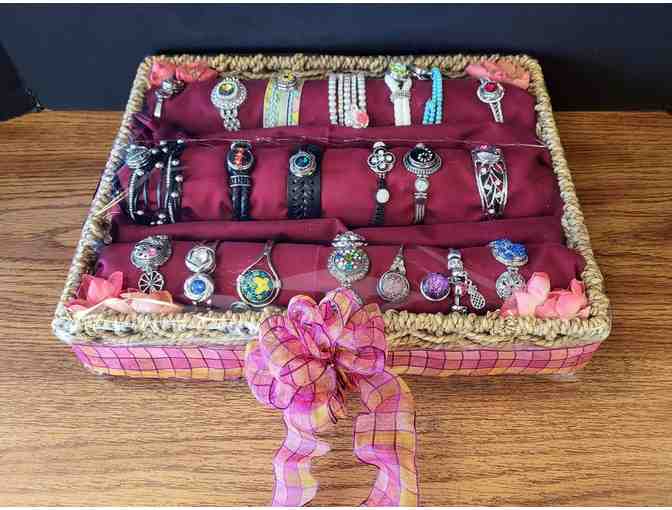 This lovely basket contains an assortment of interchangeable snap jewelry. There are 20 bracelets and 25 snaps.