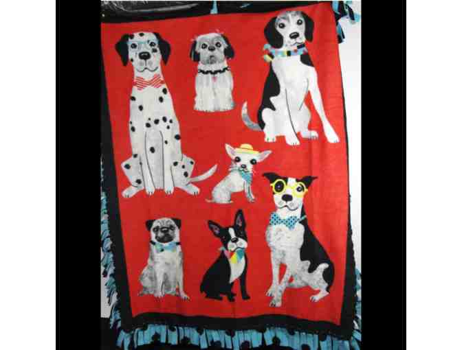 Different dogs on red fleece on the front and black solid fleece on the back of the blanket. 100%polyester anti pill fleece Length of blanket is 47"x 59" Care: Machine wash normal cold, non-chlorine bleach, tumble dry low, do not iron
