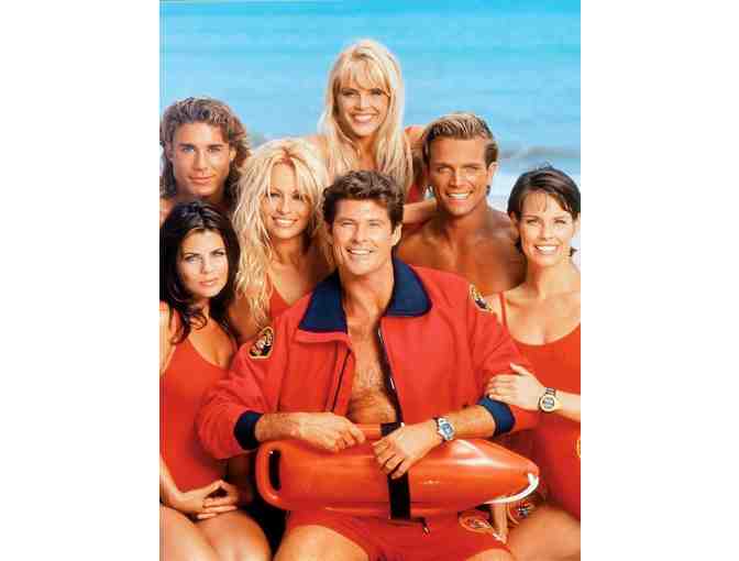 Signed Baywatch Script, Baywatch cap, two Baywatch Barbies and Baywatch red lifeguard flotation device.