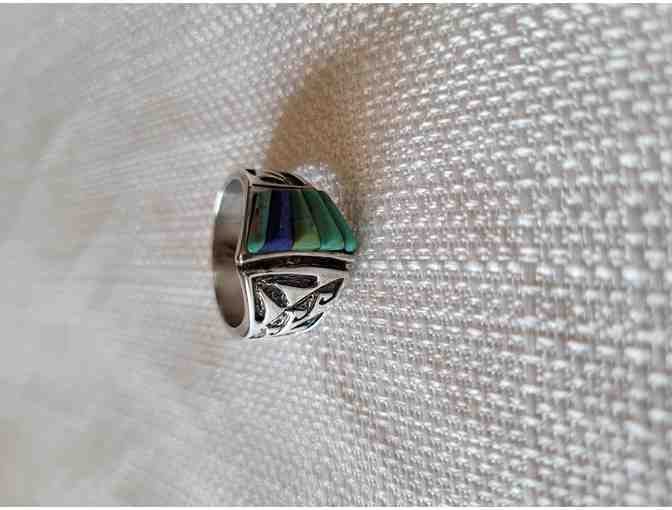 Sterling silver ring with Kingman turquoise and Lapis stones. Ring is size 10 1/2. Lovely engraving on front of band. Ring is substantial weight. Measures 5/8" L at widest and 1/4" at back.