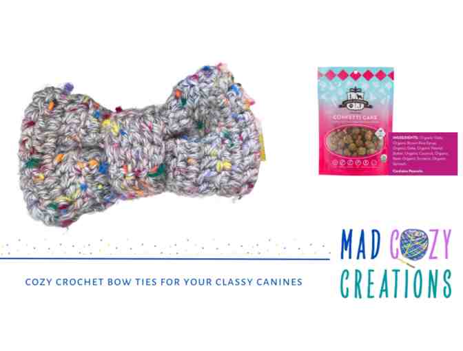 1- MAD Cozy Creations crochet dog bow tie, lovingly handmade in Massachusetts by an NMDR adopter (sizes: small, medium, or large) 1- 3oz Lord Jameson Little Rewards Confetti Cake Grain-Free Dog Treats