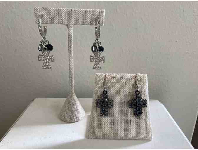 Two sets of dangle cross earrings in good condition, no missing stones. Costume jewelry, silver-tone and black metal. Embellished with rhinestones and beads.