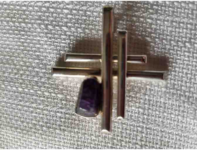 Sterling Silver pin with purple stone, possibly Sugilite. Pin is 1.75"W and 1.75"L. Pin can be turned in any direction.