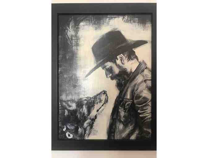 This original Western art painting is entitled "GOOD GIRL" and was painted in black and white acrylic paint by Western artist Mary Luttrell. The painting measures 12" x 16" and comes framed with a wire hanger in the back. The painting and the frame are both in excellent condition.
