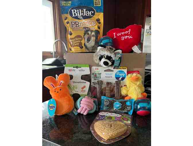 Here is a great gift for someone getting a new puppy. Toys include a cute peeps plush toy, red heart plush toy with "I woof you" on the front, flat raccoon toy without stuffing, a Kong platy duck toy with extra squeaker, a rope ball for good chewing, and 2 Kong squeeze balls.Treats include PBnanas soft treats that are great for training, Nylabone Healthy Edibles, Benebone wishbone, and Yummy comb treats for clean teeth. There is also a heart shaped cookie treat. A lucky puppy will be very happy:-)