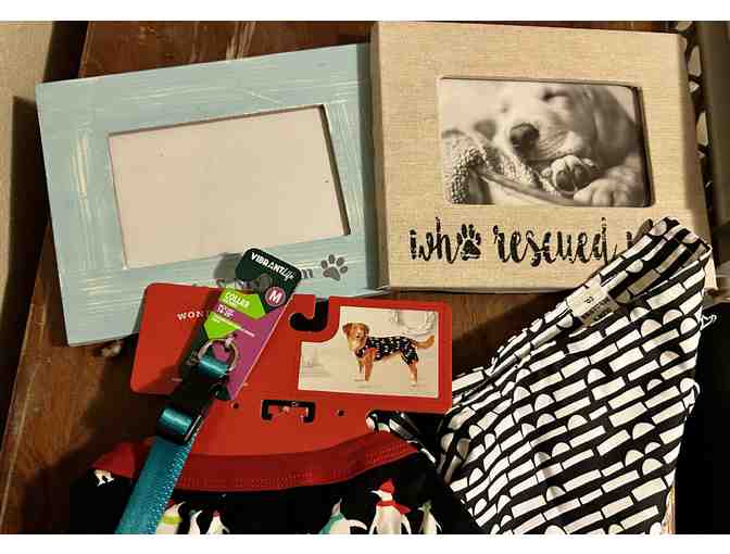 2 dog picture frames , 2 medium collar, pajamas and 2 bandannas. Not pictured daisy collar and Dino bandanna.