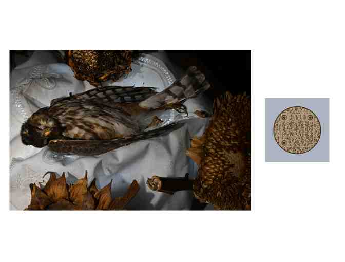 The still life is inspired by the Dutch and Flemish still life paintings of the 16-17th century. The subject matter of the still life is a Cooper hawk found on my property and dried sunflowers (which is the emblematic flower of Ukraine) from my garden laid on an embroidered European tablecloth, which once belong to a late friend of mine, who’s father was from Ukraine. Coincidentally, according to a source, in the past Ukrainians were called “hawks” by Polish people.