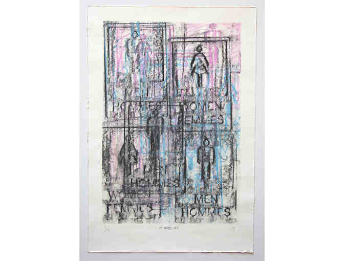 This piece is a monoprint rubbing of bathroom signs and an accompanying video artwork of the performance that led to its production. While a monoprint rubbing on the surface, the work can also be understood as the documentation of an ongoing performance and sustained engagement of the artist with the historic and exclusionary gender binary.