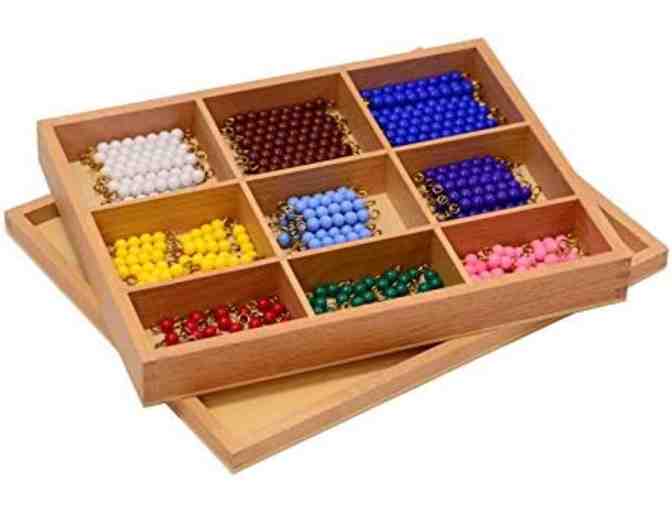 The Montessori method uses Colored Bead Stairs and Golden Bead Materials to visually represent the quantity of a number and how those numbers interact with each other. The beads can also be used to visualize and physically complete addition, subtraction, and multiplication.
