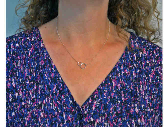 This beautiful Italian silver double hoop pendant on an 18” adjustable chain is simple enough to dress up an outfit or wear every day.