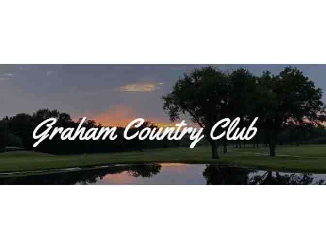 An 18-hole round of golf for two at Graham Country Club in Graham, TX. Valid Tuesday - Sunday. Appropriate golf attire is required; no denim. Certificate expires on June 1, 2024. Facility URL: https://grahamcountryclub.com/