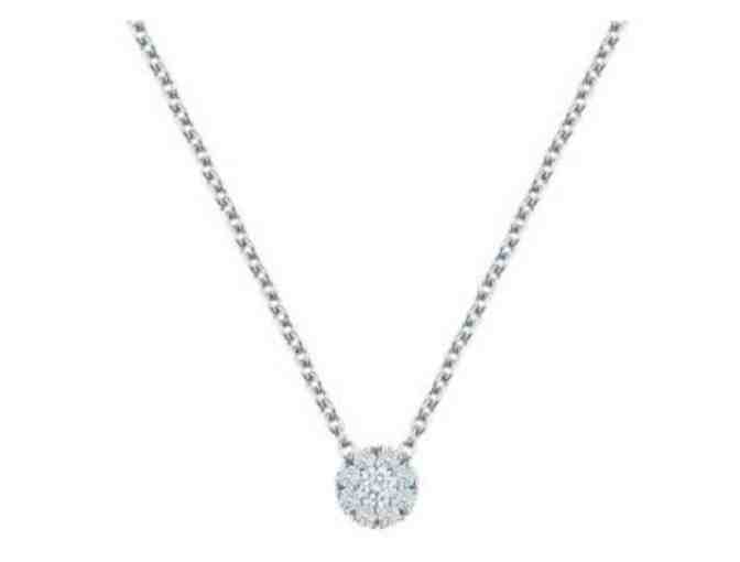 This stunning round diamond cluster pendant has a total carat weight of 0.11ct is made of 18kt white gold.