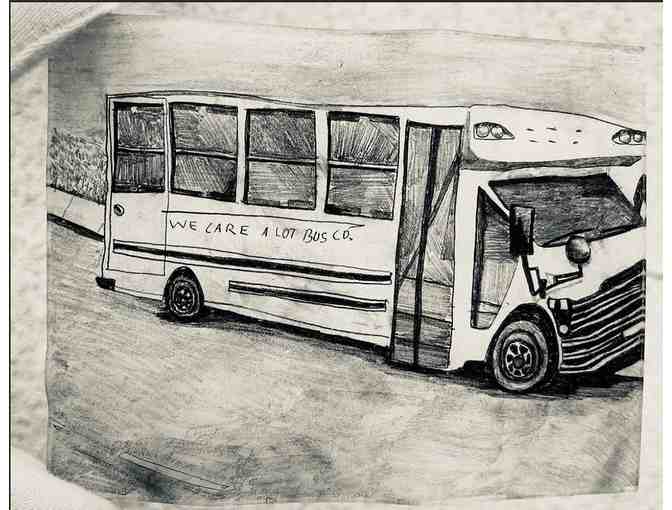 "We care a lot Bus Co." - pencil on shrunken plastic, 3-1/4” x 4”