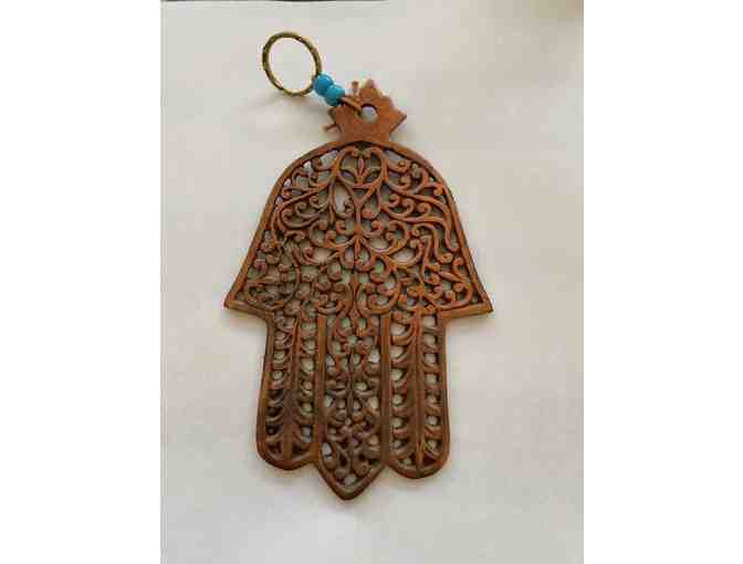 A hamsa for your home! Lovely copper plated hamsa with turquoise beads from Boutique Dahlia, located on Emek Refaim in Jerusalem's German Colony. Never hung, with original packaging.
