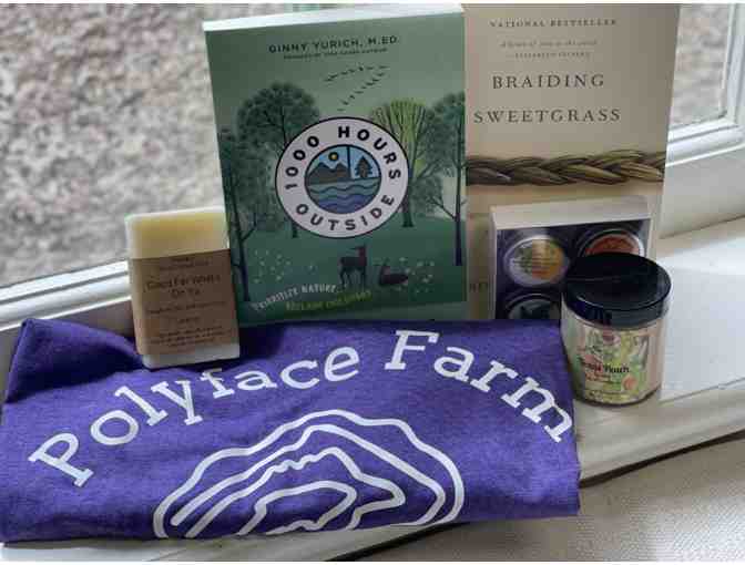 Expand your mind with two fantastic reads - "1000 Hours Outside" by Ginny Yurich, M.ED. and "Braiding Sweetgrass" by Rovin Wall Kimmerer. And don't forget to show your support for Polyface Farm with a stylish purple Polyface Farm shirt in size XL.