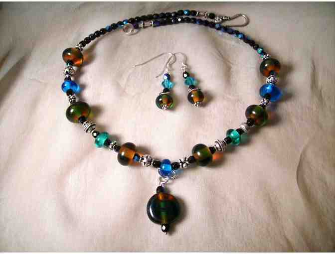 A subtle blend of amber, teal and aqua lampwork glass beads is hi-lighted with black Czech AB crystals and Bali style findings. This 17" necklace is meant to be worn short so that the peacock dangle rests near the clavicle. This gorgeous necklace comes with matching earrings.