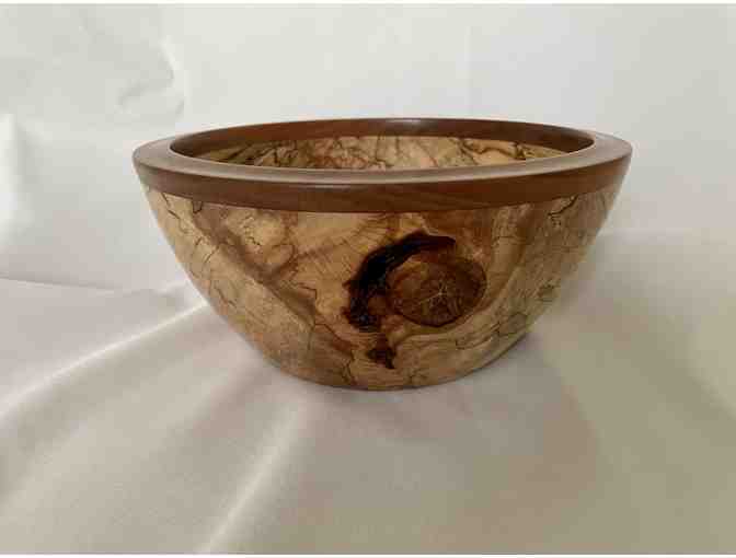 Doug Almoney is a 1961 graduate of Oakwood High School. He graduated from The Ohio State University College of Dentistry, had a 3 year military tour with the US Army, and returned to Oakwood to begin his dental practice. He and Anne have 3 children and 4 grandchildren who attended Oakwood schools. His passion for the beauty of wood and woodworking began in Junior High shop class taught by Mr. Cato. He has been a furniture builder for many years but has concentrated his woodworking on wood turning for the last 15 years. The various natural colors and textures of the wood is what inspires his work. This bowl is turned from spalted beech from Drummond Island, Michigan and trimmed with cherry.