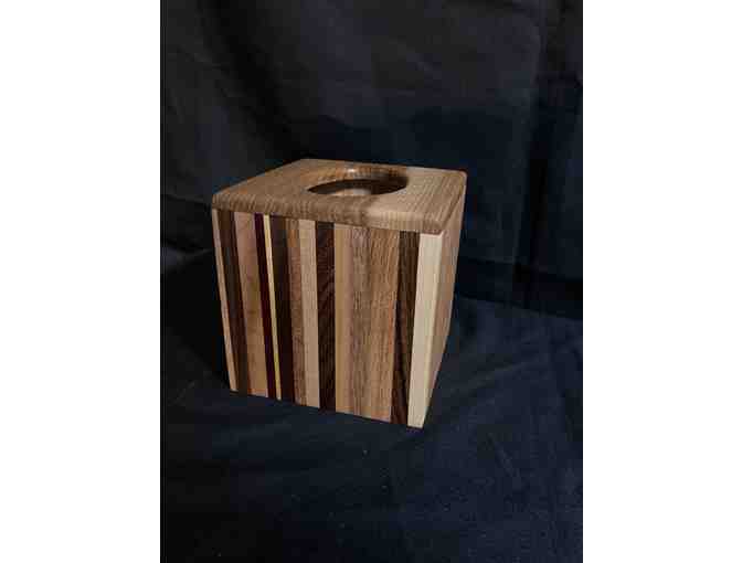 As beautiful as it is practical, this handmade tissue box by Chuck Beers conceals your tissue box underneath a work of art! This piece of art has a Red Oak body with Quarter Sawn Oak Top. The front is made of: