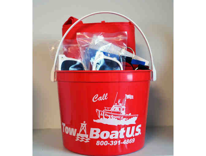 $50 gift card to West Marine. Also includes: reusable bag, drink koozie, chip clip, floatable key ring, key rings, two pairs of sunglasses, tide table, childrens bucket.