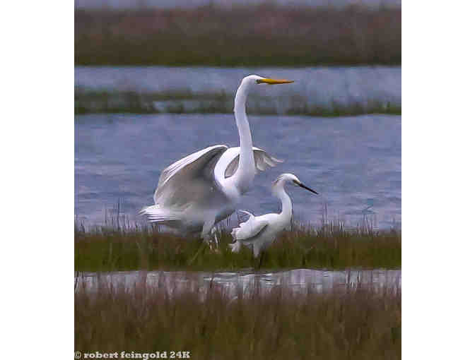 “I was watching the Snowy Egret flit around in the shallow pond near the Let at Barneys Joy when a Great Egret landed nearby. Both were fishing. I then focused on the Great Egret when it suddenly took off. It flew off, then circled back and landed right next to the Snowy. I was ready and captured a moment of unusual beauty.” – Robert Feingold