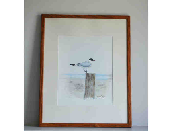 A lovely framed watercolor of a Laughing Gull at the beach. Painted by the late Carol Veiga.