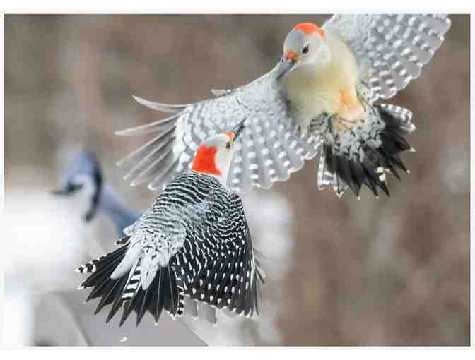 A glossy print featuring Red-bellied Woodpeckers. These two female Red-bellied Woodpeckers are having an aerial disagreement over who owns the peanut pile.