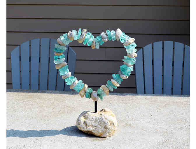 Brighten your garden and outdoor space with this beautiful heart shaped beach glass and stone wreath. Beach glass shimmers in the suns light.