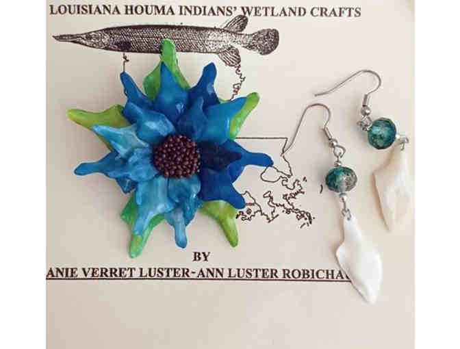A lovely Native American craft by an award-winning jewelry artist from Louisiana, Janie Verret Luster. She is a Master Artist of the State, and received the United Houma Nation Cultural Preservation Award, as well as the Louisiana Division of the Arts Folk Life Fellowship Award. It is made of Alligator Garfish scales - a Native tradition.