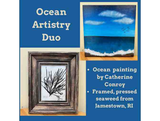 Two ocean themed pieces of art. Ocean painting by artist Catherine Conroy and framed pressed seaweed from Jamestown, RI. A perfect duo for your seaside vacation home or as a gift for a fellow ocean lover.