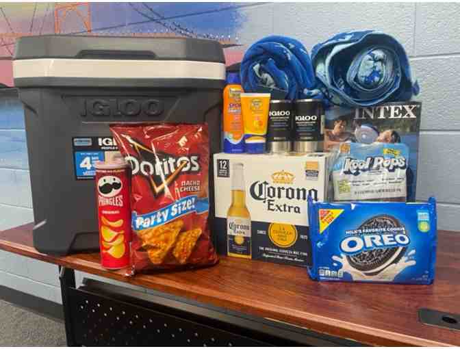 Igloo Cooler, Michigan Outdoor Blanket, Pool Float for two with cooler built in, Michigan Beach towels, 2 Tumblers, 2 Bottles Banana Boat Sun Protection, 1 package Kool Pops, 1 package oreos, 12 Bottles Corona Beer, 1 container pringles, and 1 bag of Doritos