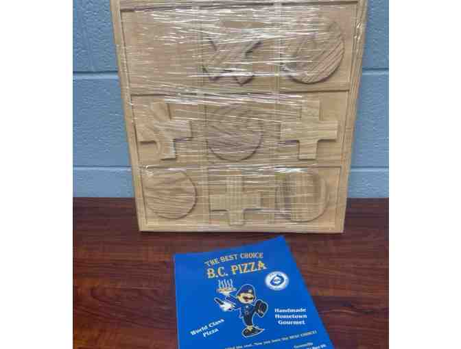 Hand carved wooden tic tac toe game with 1 free Large 1-Topping BC Pizza, 1 Large Gourmet Pizza, and a BC Coupon Book!
