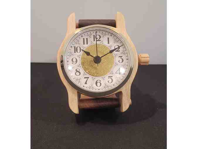 Is it a watch, or is it a clock? It's both! It resembles a watch, but functions like a clock. The watchband was handcrafted by Vince, and is made of birch and walnut. This unique piece measures 7"L x 4"W x 5"H. Requires one AAA battery, which is included.