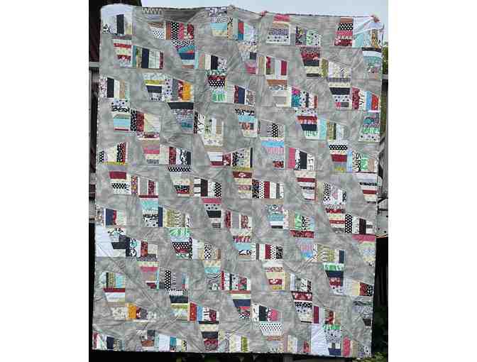 The "Shark Teeth" title is all about design; the only thing that's "sharp" is the look! This quilt's pattern and colour choices will have you smiling in your sleep! It was pieced and quilted by Jan, has a black/gray cotton backing, and measures 100" x 82".