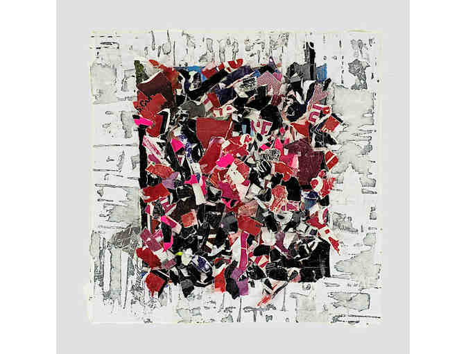 This is a collage made up of torn pieces of French street posters. The torn pieces create a depth to the work. It is framed with a white floating frame ready to hang.