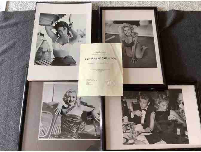Four Hollywood lithographs comes with certificate of authenticity. Two framed in very good condition. The Marilyn Monroe piece has damage to the plexiglass and the Elizabeth Taylor is not framed. Each photo is 12 x 18.