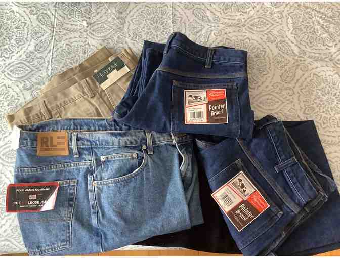 One pair Polo jeans 36x30, one pair Ralph Lauren khaki pants 34x32, two pairs Pointer brand Jeans 34x30