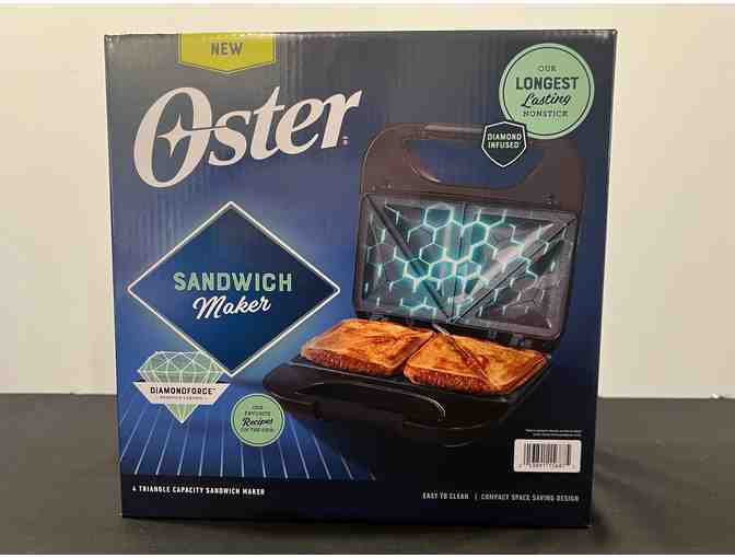 The comfort of eating a grilled sandwich...mmm! This Oster Sandwich Maker will have two sandwiches ready in just three minutes. The diamond infused "Diamondforce" nonstick coating is durable, long-lasting, and scratch resistant. The appliance is easy to clean and has a compact space saving design.