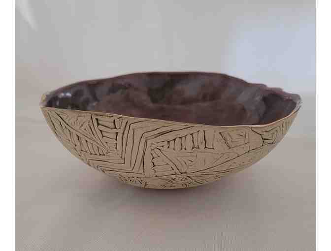 This artisnal bowl is not only beautiful; it can be used every day in any area of your home. The hand built (by Julie) ceramic dish is approximately 2.5"H x 7"W and has an elegant gold lustre on the rim.