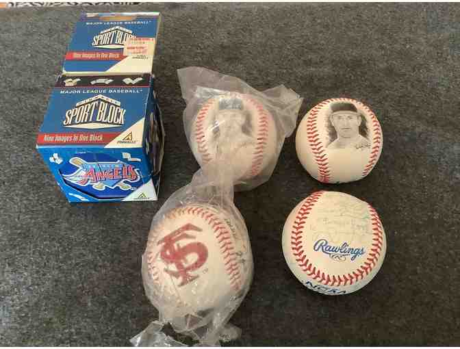 Various Baseballs, printed signatures (2) Nolan Ryan, 1 Florida State, 1 Sports Block, 1 NCAA Championship, REAL SIGNATURES.