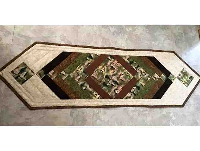 A table runner made by Mary Jane Blunda will add a festive look to your kitchen or dining room table this winter season. With a cream border and inserts of black, brown and green, this lovely runner features deer and evergreen trees.